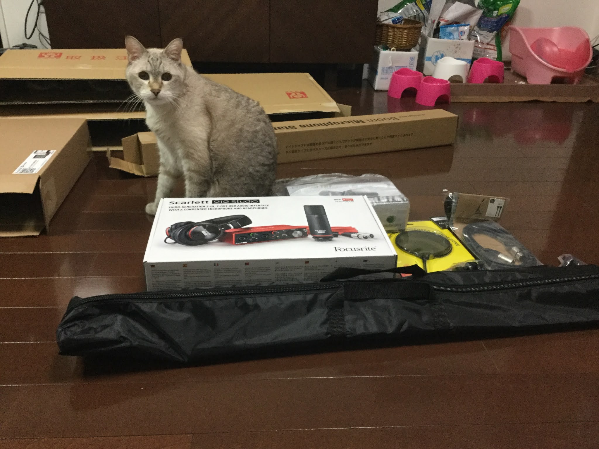 ステイホームも長くなりそうという事で、配信のための自宅での録音精度を上げようとマイクなど録音機材一式を購入しました。皆さん考える事は一緒で、マイクとパソコンを接続する変換器のような役割の「オーディオインターフェース」という、自宅録音で必須の機材が、どこも売り切れ、入荷待ちという状況で、注文をしたのは6月でしたが、8月に入り、やっと入荷の連絡が入り無事に到着しました。待望の録音機材一式です。