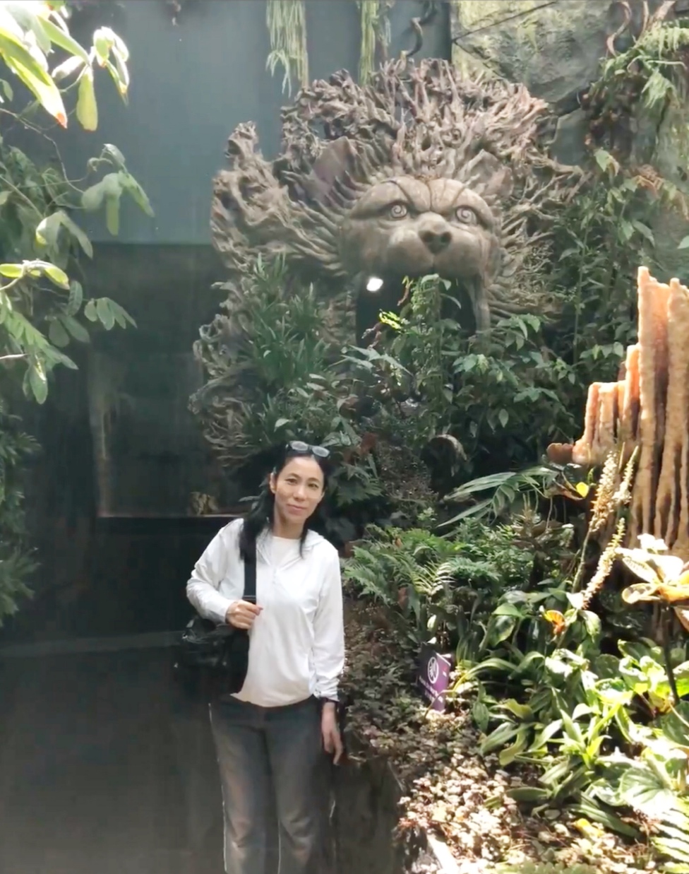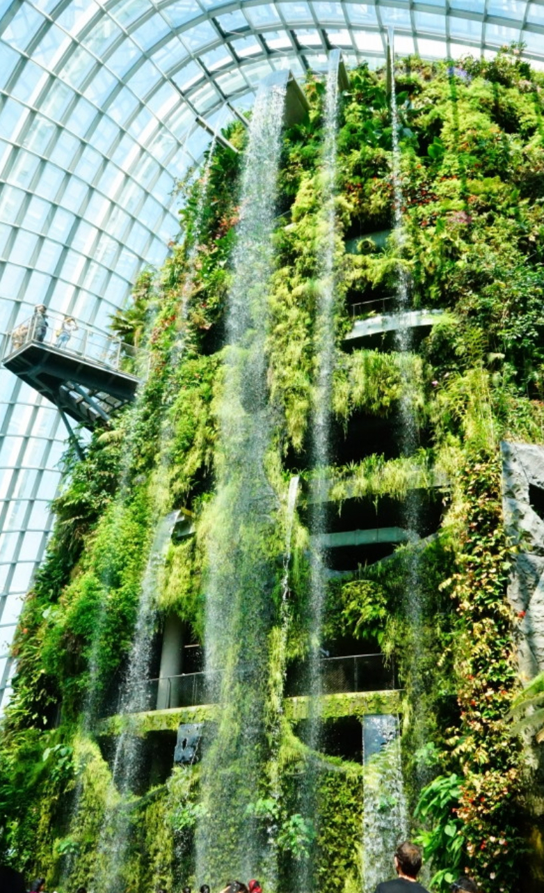 もう一つのドーム、クラウド・フォレスへ。雲の中の森と言ったドームは入り口にある天井近くまである緑の山からの滝が迎えてくれます。エレベーターでこの山の上まで昇り、宙に張り出した空中回廊を歩きながら降りてくるのは、結構スリルがありました。水のしぶきも飛んできて、熱帯雨林を歩いてる気分です。
