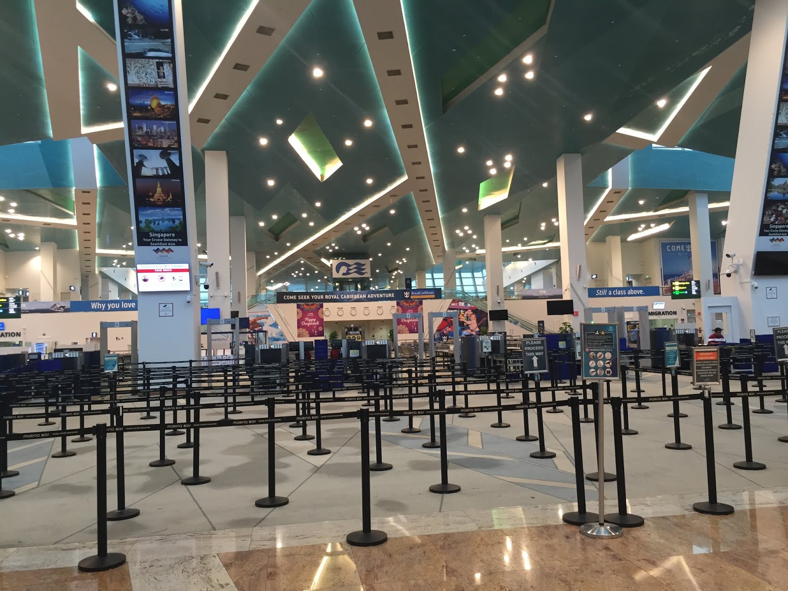 クルーズ船に乗るチエックインカウンター、早朝でお客さんは誰もいません。