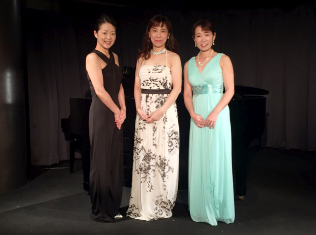 発表会後、久しぶりに上広先輩(淡い緑のドレス)とピアニストの藤里(黒のドレス)さんともゆっくり食事しながら、色々お話しもできました。このお二人がいなければ、この会、成立しないです…