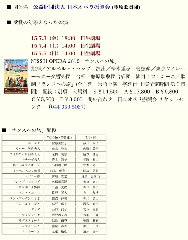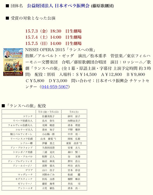 昨年、藤原歌劇団の公演「ランスへの旅」に出演しましたが、その公演が三菱UFJ信託音楽賞の奨励賞を受賞しました! 私の藤原歌劇団デビューになった、初ロッシーニにトライした思い出深い作品です。こんな賞を頂く作品、プロダクションで、歌わせて頂いた事に感謝です。嬉しいです!